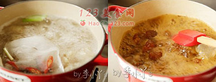 3、锅里的水煮开后边煮边用勺子撇去浮末,撇干净为止,然后烹入生抽、老抽、料酒、冰糖,接着投入葱姜和香料袋,转小火,盖上盖子焖3小时左右,开盖放入盐调味后转大火收汁即可。