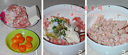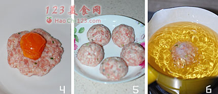 4.、5、取拌好的肉末按成饼状,包上咸蛋黄,然后收口滚圆(包法就和包元宵一样,用虎口慢慢收。包的肉末要多点,不然炸的时候会露馅)。