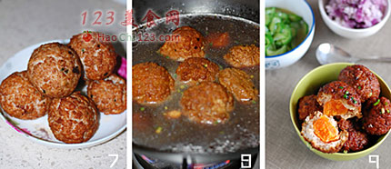 6、油锅烧至八成热,下入做好的狮子头炸至金黄。