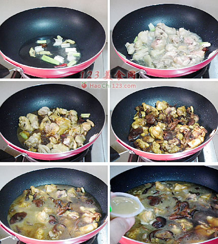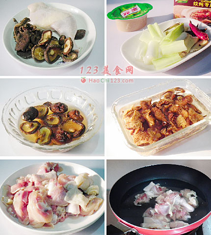 10、翻炒均匀后加入泡发的香菇和榛蘑。