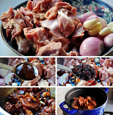 4、花牛提前把大雁去油脂、切好块,用调味腌制上;用珐琅锅,不加一滴水,焖出一锅美味。煮出来的东西又软又烂,入味又好吃。整个菜吃着很清爽,虽说是大肉,香的诱人,好入味哟!而且在酱料上花牛也加了不少创意,把老干妈与甜面酱相结合,完美的酱香与微辣的口感。真心不错哟!