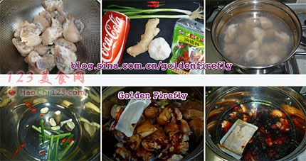 6、做法5中加入所有的調味料+萬用滷包+可樂+清水,總的水量蓋過豬腳,開大火煮至滾沸後,蓋上,鍋蓋轉小火滷約1小時,後悶40分鐘。完成。
