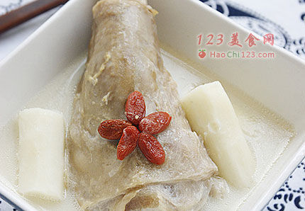 8、煮至山药软绵,撒入枸杞和盐即可。