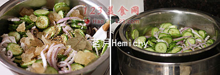 7、在一个大盆里放入黄瓜,洋葱丝、撒上冰糖、盐,倒入白醋,再放上少许香叶、小茴香籽、芥末籽,用一双没有沾过油的筷子,搅拌均匀。