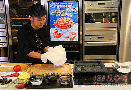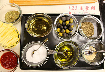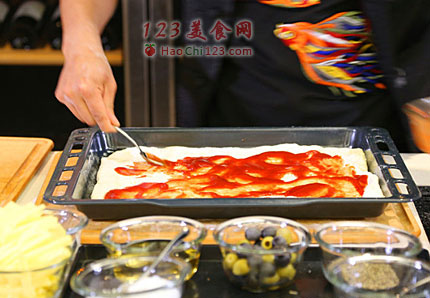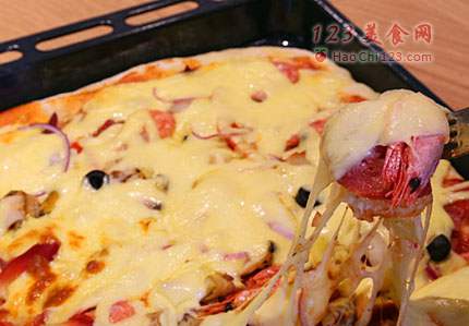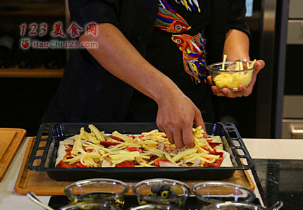 3、码放上各种海鲜和萨拉米香肠片、覆盖上马苏里拉奶酪。