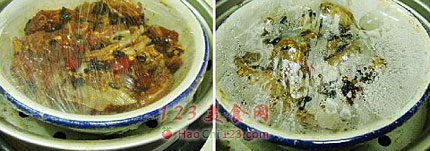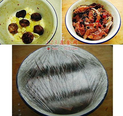 3、干香菇用水泡发,和姜片,蒜片一起垫到容器的底部,将拌匀的野鸡和豆豉,辣椒放在香菇姜蒜的上面。之后在容器上包裹上2-3层保鲜膜。