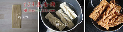 10、油炸,油温控制在放入生坯后冒出大气泡的程度。