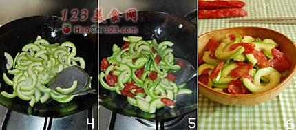 4、整个炒制过程要快,西葫芦很容易就熟了,腊肠也是稍翻炒即可食用,如果炒制时间太长,蔬菜颜色就不绿,形状也不好了。[LaoYanHuo.com]