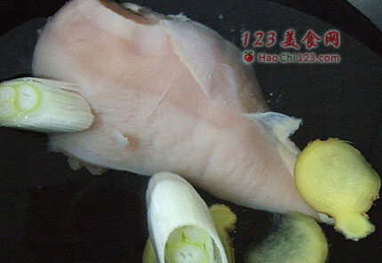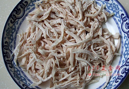 4、晾凉的鸡肉撕成细丝(鸡胸肉用冰水镇一下口感更好)。