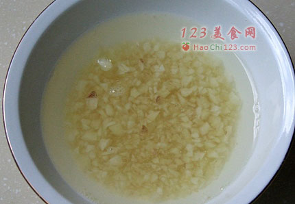 2、大蒜拍扁剁碎,加点盐和凉开水浸泡。