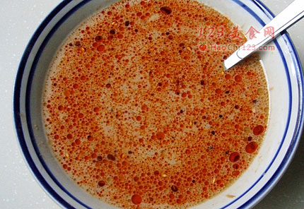5、取花生酱四勺,分次添加凉开水,稀释花生酱,最后添加蒜泥和蒜泥水、盐、糖、生抽、香油和辣椒油,搅拌成酱汁儿。