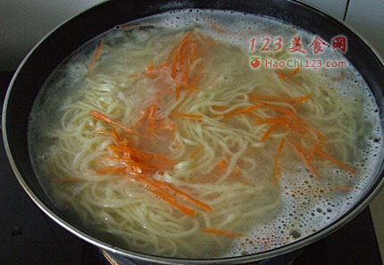 7、再点一次凉水煮开,加入胡萝卜丝煮开。