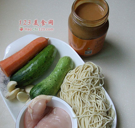 9、取适量面条和胡萝卜丝入碗;加入适量黄瓜丝和鸡丝,调入适量酱汁儿,拌匀即可。
