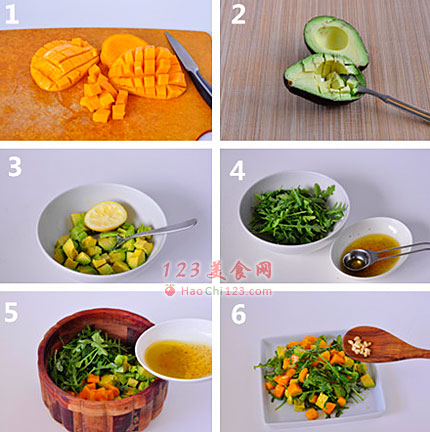 5、将芒果丁、牛油果丁、生菜叶一起放进沙拉大碗,加入酱汁,拌匀。