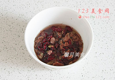 2、干果类洗净擦干水分,切成小丁,放入小碗中,淋上3大匙红茶液浸泡入味。