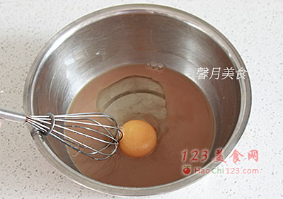 3、作法1剩余的红茶液散热后取60ml倒入盆内,再加入酵母粉混合均匀,加入细砂糖和鸡蛋,用打蛋器搅拌均匀。