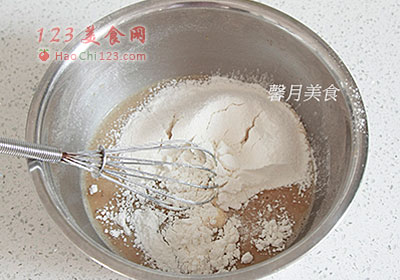 4、取1/2量的面粉(90克)和盐混合过筛至3中,拌匀至无干粉无颗粒。
