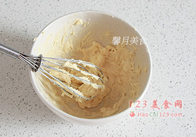 5、黄油放入别一盆中,用打蛋器拌至质地呈现霜状,加入作法4中,再用打蛋器拌至粘稠光滑状。