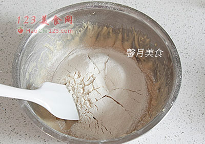 6、将剩下的面粉过筛至5中,用刮刀充分搅拌至顺滑。