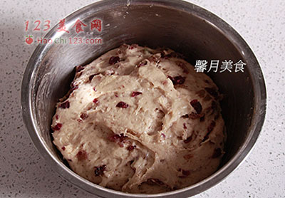 7、将果干挤净汁液加入,大致拌匀,盖上保鲜膜,在室温下静置1-2小时,待面糊膨胀至原来的约2倍大。