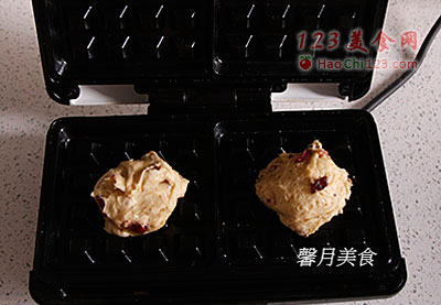 8、松饼机预热后,用毛刷沾上少许油涂抹在模具表面,用汤匙将面糊大致分割成8等份,每次往机器上添加一份,盖上盖子,烘烤3-4分钟左右即金黄至全部完成即可。