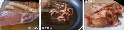 3、用肥肉熬的油煎瘦肉培根片儿,就不用再加油了,煎得表面有点微微上色,不要太干,否则就太难卷了。