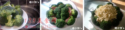 5、西兰花捞出沥水,挑几个裹上培根片,可以加一点点盐调味,不要多,培根已经很咸了。