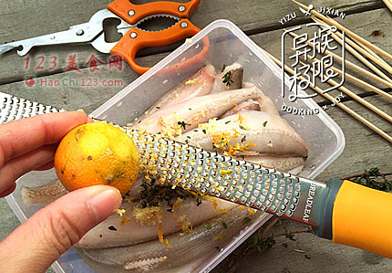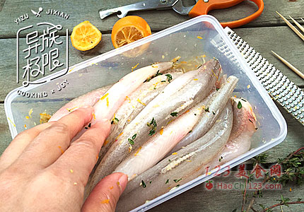 2、将鱼冲洗干净沥干水分放入大容器里,百里香香草取嫩叶,剪碎放入;姜用芝士刀搽成茸;柠檬用盐摩擦一遍,用水冲去咸味,继续搽出薄皮放入鱼盒里。