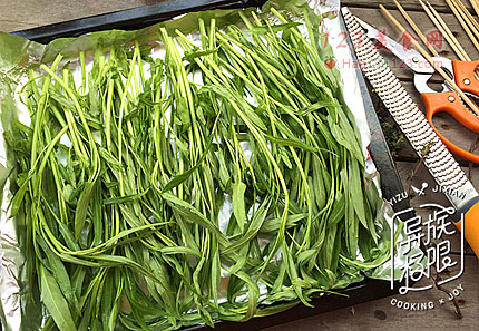 4、利用腌鱼时间,将洗好的通心菜放入铺有锡纸的烤盘上,并刷上一层食用油。