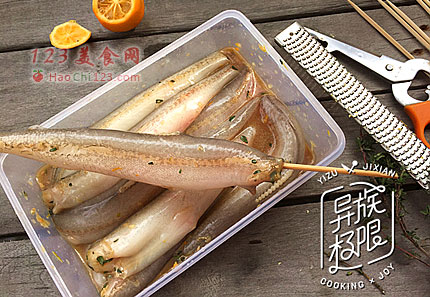 5、继续给鱼加料,鱼露1.5勺,生抽1小勺;继续按摩,腌制15分钟;腌制过的鱼用竹签串起来。