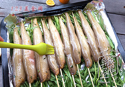 6、串过竹签的鱼铺在烤盘上,刷一层食用油;
