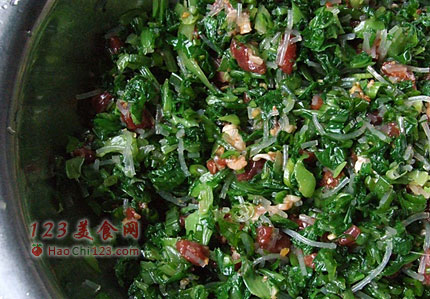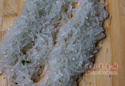 4、粉条入开水中煮至变软无硬芯;捞出冲凉沥干水分,切碎。