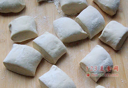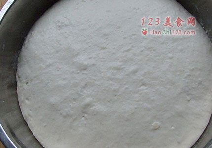 7、准备馅料之前,提前用500克面粉加4克左右酵母加约250克水,揉成一个面团放在温暖处静置发酵。面团蓬松至原料的2倍大小左右,取出发酵好的面团。