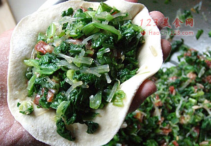 9、擀成四周薄中间厚点的圆形面皮,包入馅料,捏紧收口处。