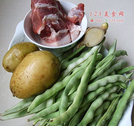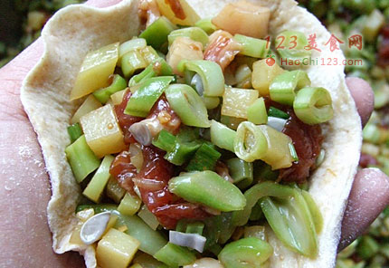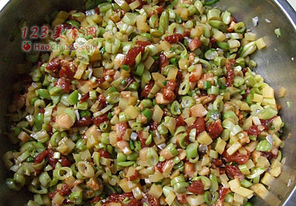 6、晾凉以后的芸豆土豆和酱好的猪肉丁混合,添加油、盐和一点点糖调味,最后添加切碎的小葱拌匀。