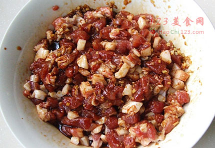 2、猪肉刀切成大小均匀的肉丁,添加点肥肉的猪肉做馅,味道更鲜香;切好的肉丁加生姜末、白胡椒粉、料酒和酱油拌匀腌制(可以用自己喜欢的风味面酱或辣酱等腌制猪肉)。