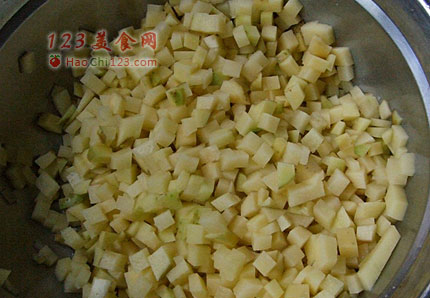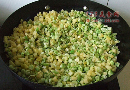 5、起油锅,油热后,下入芸豆和土豆颗粒煸炒,炒至蔬菜生味去除,并且颜色变至透明,关火,晾凉。