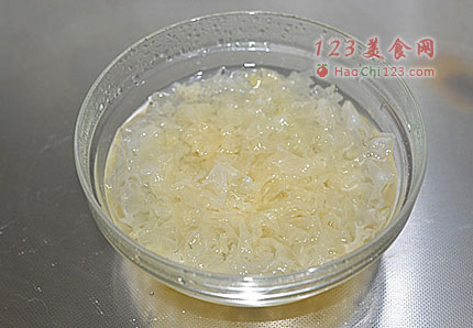 2、银耳用清水泡30分钟变软后,去掉根部用手撕成小朵。