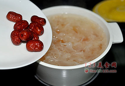 5、加入洗净的红枣,继续煮1个小时此时汤汁已经浓稠软烂。