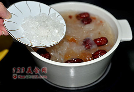 6、加入冰糖,再继续煮10分钟。至冰糖完全融化后即可。