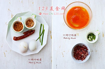 二、做法:1、将甜肠丁、萝卜干、虾皮和葱花放入鸭蛋中。