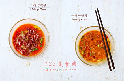 2、各种材料先与蛋液混合,炒制过程中更加方便。