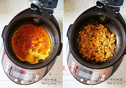 3、自动烹饪锅加入适量油,选择“炒”程序,预热后倒入蛋液。
