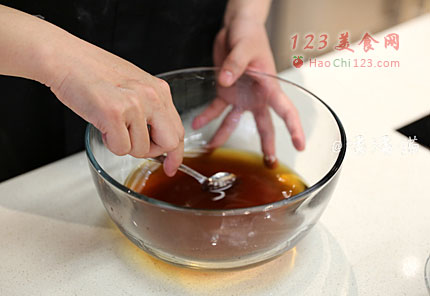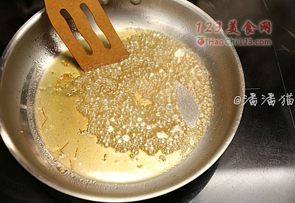 5、将一半的糖酒汁放入炒锅中熬稠。