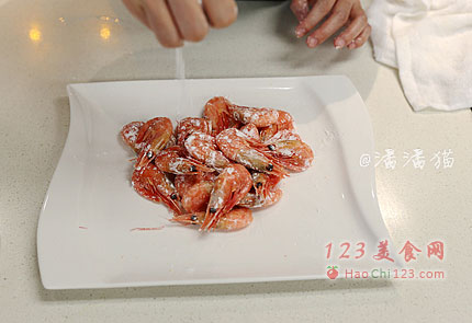 2、在北极虾上用手指弹上适量淀粉,并用手抓匀。