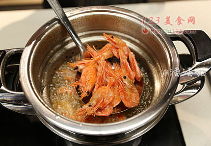 3、将虾放入5-6成热的油锅中炸制,炸至金黄后捞出,待温度升高后再次放入进行复炸30秒后捞出尽量控干油份。