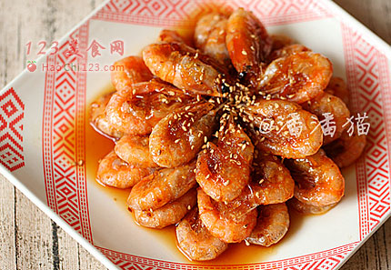 6、将糖酒汁用勺子淋在摆好盘的虾上。