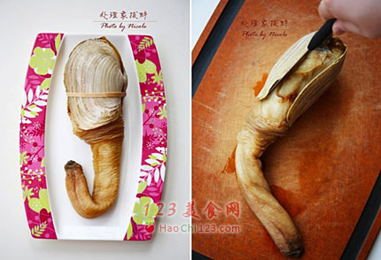 2、将象拔蚌放在砧板上,用刀沿着一侧的蚌壳划开,注意刀要紧贴蚌壳。