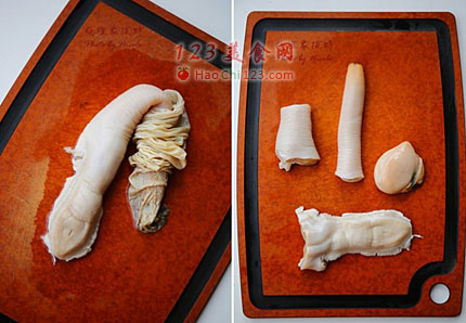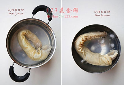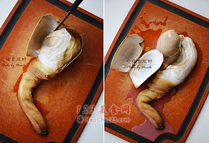 6、取出迅速浸入冰水,此时会发现如“象鼻子”的部位有一层如丝袜般的膜已经蚌肉脱离。