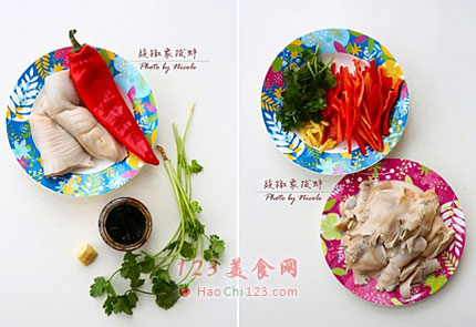 二、准备:象拔蚌切块,红椒切丝,香菜切碎,姜切丝。